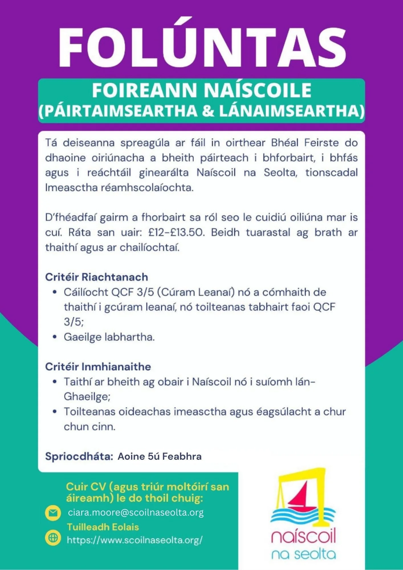 Cuir CV (agus triúr moltóirí san áireamh) le do thoil chuig: ciara.moore@scoilnaseolta.org