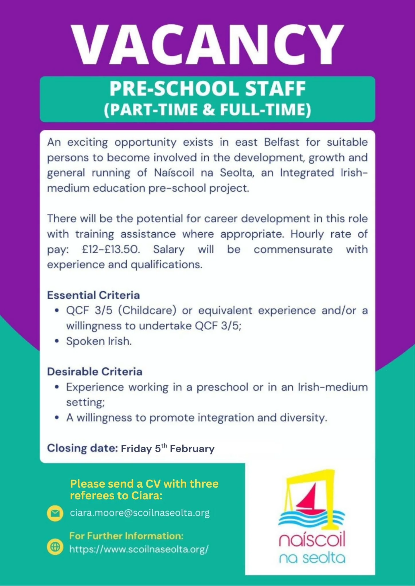Tá deiseanna sprégúla ar fáil in oirthear Bhéal Feirste do dhaoine oiriúnacha a bheith páirteach i bhforbairt, i bhfás agus i reáchtáil ginearálta Naíscoil na Seolta, tionscadal Imeasctha réamhscolaíochta.